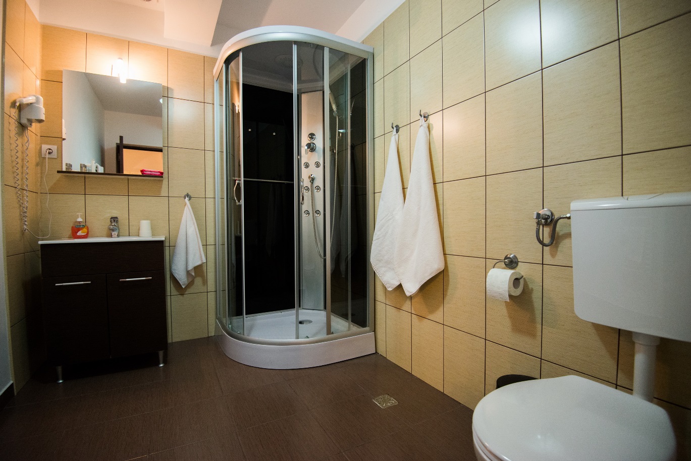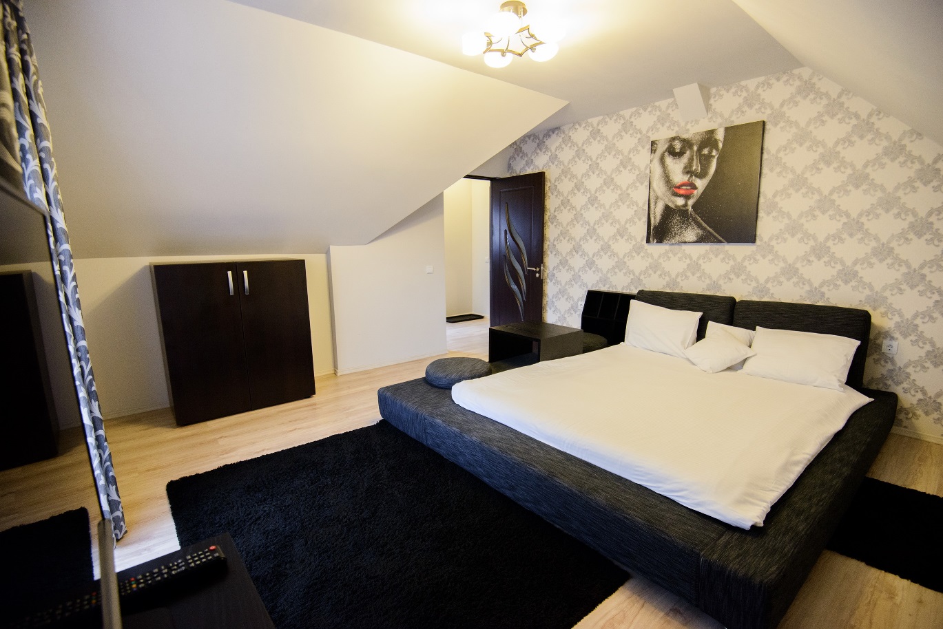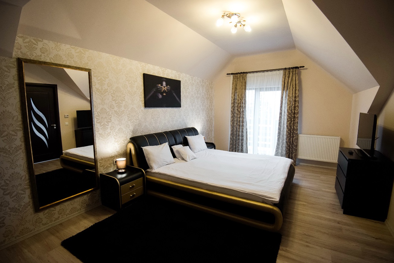 La mansarda unitatii se afla 3 camere duble si un apartament cu doua camere,iar cele 3 camere de lux se afla la parter, fiecare cu dotari de lux: bucatarii modern si complet utilate(cam.1,2 si 3), tv-led, bai proprii cu cabine de dus cu hidromasaj, wireless, etc.