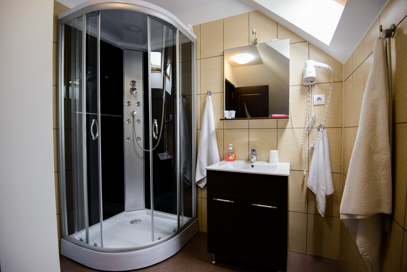 La mansarda unitatii se afla 3 camere duble si un apartament cu doua camere,iar cele 3 camere de lux se afla la parter, fiecare cu dotari de lux: bucatarii modern si complet utilate(cam.1,2 si 3), tv-led, bai proprii cu cabine de dus cu hidromasaj, wireless, etc.